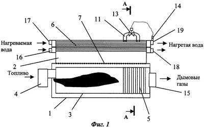Котел содержит корпус, частично заполненный водой, состоящий из цилиндрической обечайки 1 и паровой камеры 2, топочную камеру 3 с горелочным устройством 4 и вертикальным конвективным пучком теплообменных труб 5, вваренных в хвостовую часть корпуса камеры 3. В камере 2 размещен трубчатый подогреватель 6. В цилиндрической обечайке 1 под камерой 2 вырезаны перфорационные отверстия 7 для прохода пара к подогревателю и возврата конденсата в зону кипения. Подогреватель 6 разделен на две секции 8 и 9 по нагреваемым теплоносителям. Секция 9 помещена в отдельный отсек 10, соединенный паровой линией 11 с паровым пространством секции 8, и конденсатной линией 12 с корпусом котла, ниже уровня воды. На паровой линии 11 установлен регулирующий клапан 13, соединенный по исполнительному механизму с датчиком 14 температуры нагретой воды в секции 9. Котел снабжен патрубками отвода дымовых газов 15, подвода и отвода нагреваемых теплоносителей 16, 17, 18 и 19, патрубком вакуумирования и отвода неконденсирующихся газов 20.