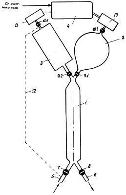 Рабочая камера 1 со стороны ее первого (“холодного”) торца соединена: с линией 5 подвода газа высокого давления через впускной управляемый клапан 7 и с линией 6 отвода газа низкого давления через выпускной управляемый клапан 8. Рабочая камера 1 со стороны ее второго (“горячего”) торца соединена через управляемые клапаны 9.1 и 9.2 соответственно с первой 2 и второй 3 дополнительными камерами. Первая дополнительная камера 2 посредством линии, содержащей откачное устройство 10 и управляемый клапан 10.1., соединена с буферной емкостью 4, а вторая дополнительная камера (в предпочтительном варианте осуществления способа) посредством линии, содержащей нагнетающее устройство) 11 и управляемый клапан 11.1 соединена также с буферной емкостью 4. Средства, обеспечивающие контроль давления газа в дополнительных камерах 2 и 3, на чертеже не показаны. Линия 12 подачи газа во вторую дополнительную камеру 3 из линии 5 показана на чертеже штриховой линией. Объем Vк рабочей камеры 1 и объем V второй дополнительной камеры связаны соотношением Vк=(0,5÷1)·V.