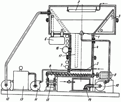 На чертеже показана принципиальная схема установки сублимационной сушки для обезвоживания термолабильных продуктов с комбинированным энергоподводом. Установка состоит из сушильной камеры цилиндрической формы с источниками СВЧ 16 и ультразвука 4. В верхней части сушильной камеры расположена распылительная камера, на крышке которой закреплен ИК-излучатель 2. В камере имеется собственный десублиматор 3, а также через шиберный затвор к ней подключен вакуумный насос 12. В нижней части через вакуумный затвор 15 камера соединена с выгрузным шнеком 8. Кисломолочный продукт питателем-дозатором (насосом) 10 подается из резервуара 14 и распыляется через ультразвуковую форсунку 1 в распылительной камере. Режим подачи продукта контролируется блоком управления системы распыления (СУСР). Капли йогурта в процессе полета охлаждаются и замерзают за счет интенсивного испарения влаги в вакууме. При этом капли подвергаются воздействию лучистой энергии ИК-излучателя 2. Далее капли с высушенным верхним слоем летят вниз в сушильную камеру. Сушильный агент (инертный газ, воздух) на стадии удаления остаточной влаги подается в нижнюю часть сушильной камеры через термостат 13 насосом 11 в рассеиватель 5. В сушильной камере имеется устройство отбора проб 17, которое при наладке технологического процесса позволяет снимать пробы в зонах контроля температуры и глубины вакуума. После образования вакуума в распылительной камере включаются конденсаторы (десублиматоры) 3 и ИК-излучатели 2 и через форсунку 1 подается продукт (йогурт). Начинается криогранулирование капель йогурта в поле ИК-излучения при температуре десублиматоров -35°С, поддерживаемой холодильной машиной 6. Одновременно подают сушильный агент (инертный газ, воздух), нагретый до температуры +20…+40°С. Количество подаваемого агента регулируют так, чтобы давление в камере, контролируемое датчиком 7, на уровне m0 не поднималось выше 100 Па. При достижении продуктом в камере сушки уровня m0 включается УЗИ, на уровне m5 включается СВЧ, а при достижении уровня отметки m600 (верхний уровень) вводится в действие шнек электроприводом 9 и начинается выгрузка сублимированного продукта. Процесс сушки идет непрерывно под воздействием ультразвука и СВЧ-энергиии в принудительном потоке инертного газа. Уровень высушиваемого криогранулянта в камере сушки поддерживается системой управления на отметке m600.