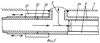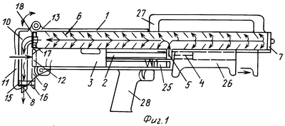 Глушитель содержит: “несущий” корпус /глушителя/ 1, Фиг.1-3; ствол 2 присоединяемого “стреляющего устройства”; ствольная коробка 3 присоединяемого “стреляющего устройства”; надульное “средство для отделения поддонов от снарядов” – газовый “переходной патрубок” глушителя 5; набор элементов 6, размещенный внутри глушителя для обеспечения сепарации и торможения потока пороховых газов; дульная съемная заглушка /корпуса глушителя/ 7; казенный “газовыпускной” патрубок глушителя 8; “нижняя казенная рама” 9 для присоединения “стреляющего устройства”; шарнирное откидное “основание для крепления резинового затыльника” 10; затыльник оружия 11; казенное окно 12 “нижней казенной рамы /9/; проушина 13, соединенная с глушителем; сдвоенная проушина 14, соединенная с пяткой “основания для крепления резинового затыльника”; продольные стержни 15, имеющие “упорную резьбу”; “гайки-барашки” 16; резиновая уплотнительная шайба 17; фланец 18 на верхней коленчатой части “газовыпускного патрубка”; кольцевой буртик 19, окружающий отверстие 20 казенного торца корпуса глушителя; резьбовая муфта /узла соединения/ 21; “утолщенная” дульная часть ствола 22 присоединяемого “стреляющего устройства”; “казенная горизонтальная трубка” 23, соединенная с “газовым переходным” патрубком /5/. Также показаны: обтюрирующий поддон 24 для подкалиберного снаряда; подствольный “трубчатый” магазин 25, присоединяемого “стреляющего устройства”; подвижное вперед цевье оружия 26; прицельное приспособление 27, размещенное на корпусе глушителя; рукоять управления огнем оружия 28.