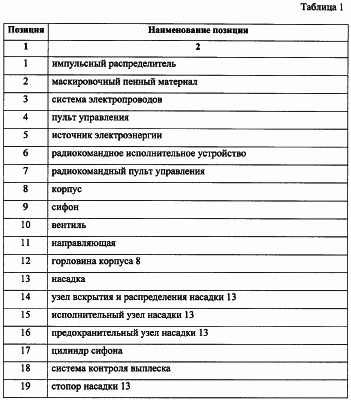9. Импульсный распределитель маскировочного пенного материала, содержащий герметичный корпус с раствором, отличающийся тем, что корпус с исходным раствором оснащен сифоном, двумя вентилями и, по крайней мере, одной направляющей, на горловине корпуса установлена насадка, содержащая узел вскрытия и распределения, исполнительный и предохранительный узлы, причем горловина корпуса сопряжена с цилиндром сифона, а система контроля выплеска, дополнительно установленная на корпусе устройства, сцентрирована со стопором предохранительного узла насадки, при этом вентили установлены на корпусе устройства в верхнем и нижнем его уровнях.
