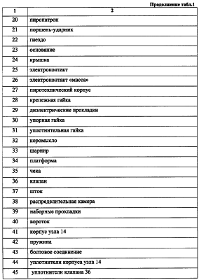 Исполнительный узел 15 содержит пиропатрон 20, поршень, ударник 21 и гнездо 22 (см. фиг.4). Гнездо 22 закреплено в основании 23 исполнительного узла 15, оснащенного крышкой 24, обеспечивает подключение насадки 13 к источнику электросигнала 3 (3, 4 и 5 или 3, 6 и 5) и соединено электроконтактами 25 и 26 с пиропатроном 20. Причем один из контактов 26 является “массой”. При этом пиропатрон 20 размещен в пиротехническом корпусе 27, установленном на основании 23 посредством крепежной гайки 28 с диэлектрическими прокладками 29, через которые пропущен один из контактов 25. Поршень-ударник 21 зафиксирован упорной гайкой 30 и “притерт” в пиротехническом корпусе 27 уплотнительной гайкой 31.