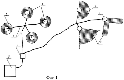 Устанавливаются импульсные распределители 1 и сопрягаются с источником электроэнергии 5 посредством электропроводов 3 и/или радиокомандного исполнительного устройства 6 пульта управления 7 (или 4) (см. фиг.1 и 2).
