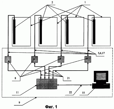 Центральный суммирующий процессор позволяет объединить несколько устройств для определения параметров многокомпонентных сред, расположенных в нескольких резервуарах, в единую установку. Функциями центрального процессора является сбор информации от блоков управления и коммутации 8 при помощи электрических проводников 21, передача информации на электронно-вычислительную машину 10 при помощи электрических проводников 22, а также передача управляющих команд от электронно-вычислительной машины на дополнительные измерения блоком управления и коммутации.