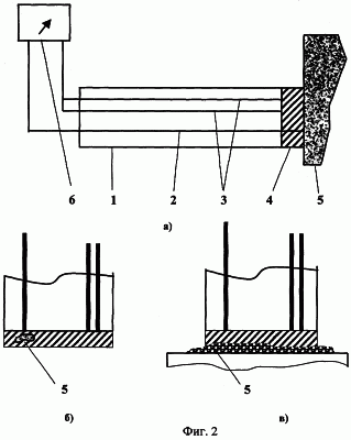 Форма сенсорной части электрода 2 не ограничивается приведенной на схеме. Это может быть, в частности, ультрадисперсная частица, либо наноразмерный слой частиц ионопроводящего полимера, либо многослойный ионопроводящий полимер с разнесением анализируемых частиц в его толще, аналогично изображению на фиг.2,б.