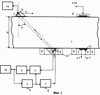 При установке времени задержки tз=2tН принятый преобразователем 2 от дефектоскопа сигнал переизлучается генератором 7 и преобразователем 9 в изделие 1 в сторону акустического блока 13 дефектоскопа через время 2tН и на экране дефектоскопа появляется на временном интервале от зондирующего импульса дефектоскопа, равной 4tН (время пробега у.з. колебаний по толщине изделия от акустического блока дефектоскопа до преобразователя 2, плюс время задержки линии задержки 5 и плюс время пробега по толще изделия в обратном направлении от преобразователя 9 до акустического блока 13 дефектоскопа). При этом глубина залегания имитируемого дефекта в соответствии с (3) составит hд=Н-tзk=Н-2tH(ctcos )/2=Н-Н=0, т.е. соответствует приповерхностному дефекту (например, трещина, развивающаяся от поверхности сканирования при обнаружении ее дефектоскопом однократно отраженным у.з. лучом). При любом другом положении времени задержки в указанных пределах от 0 до 2tН моделируемые дефекты (как бы) находятся внутри контролируемого изделия.