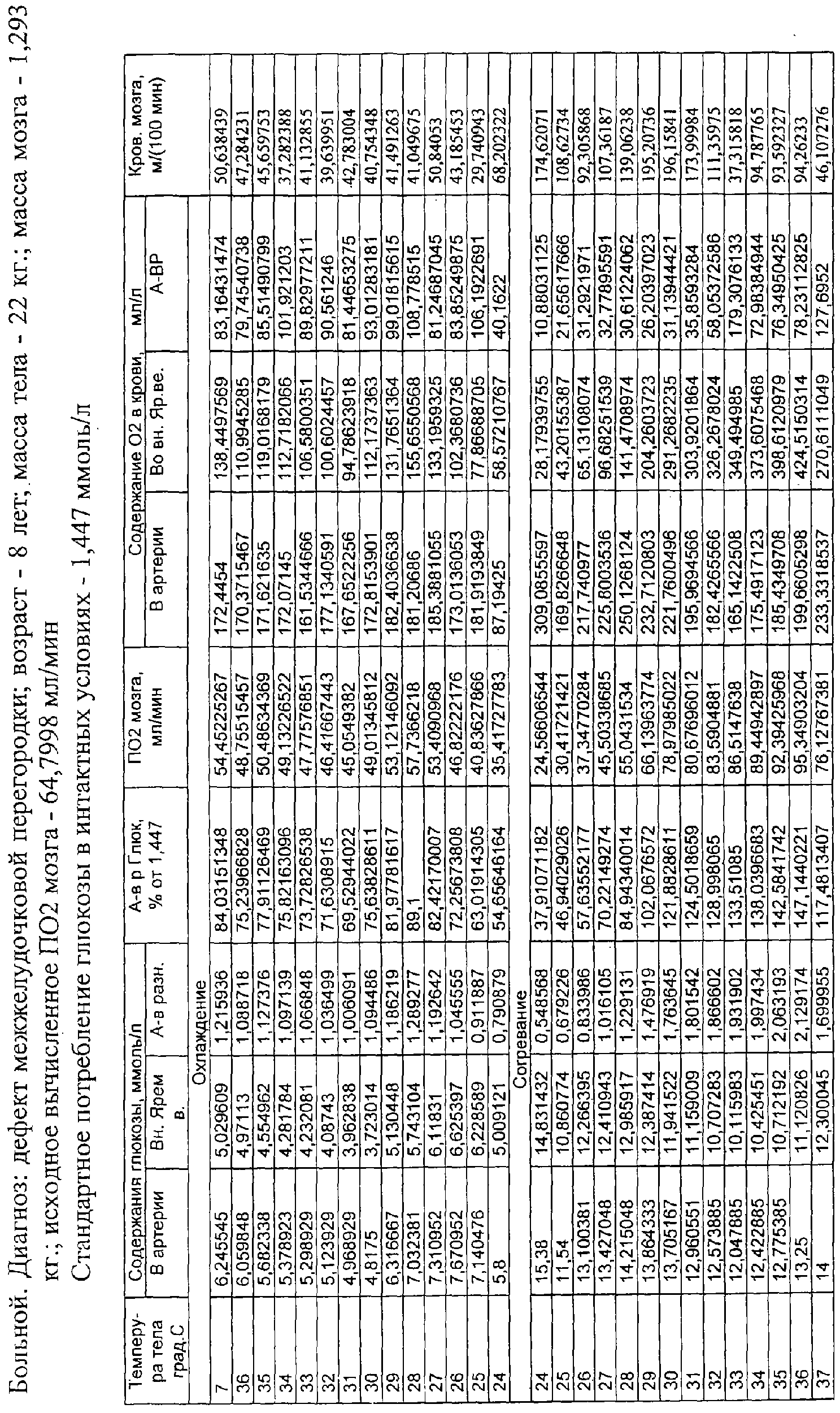 Изобретение относится к области медицины, а именно к способам оценки метаболической активности головного мозга больных, находящихся в экстремальном состоянии во время выполнения кардиохирургической операции. Во время кардиохиругической операции необходимо точно оценивать степень метаболической активности головного мозга больного, так как эта оценка является важным элементом осуществления общего обезболивания организма больного. Роль такой оценки возрастает у больных, подвергающихся операциям по поводу нарушения мозгового кровообращения. Такая оценка необходима для того, чтобы иметь хорошо аргументированное представление о метаболическом резерве головного мозга на основном этапе выполняемой операции. Известны следующие косвенные способы оценки метаболической активности головного мозга: По регистрации элетрофизиологических параметров, в частности по электроэнцефалограмме (ЭЭГ). Существенным недостатком этих способов является констатация перехода критических метаболических (энергетических) порогов головного мозга, тогда как необходимо заранее распознать приближение к метаболическим порогам. Даже более подробная динамика изменений ЭЭГ по ходу выполнения операции не может заменить точного знания величины потребления кислорода головным мозгом больного [Литасова, Верещагин, Храпов и др., 1984; см. стр.32-34]. Известны точные способы измерения потребления О2 головным мозгом с помощью инертных газов – N2O [Kety & Schmidt, 1945], либо криптона или ксенона (подробные ссылки см. Фолков Б., Нил Э. Кровообращение. М.: Медицина, 1976 г. – 463 с. стр.347-348). Этот способ обладает тем недостатком, что он требует одновременного отбора проб крови из артерии и вены на газовый анализ до равного достижения насыщения артериальной, венозной крови и ткани мозга, что занимает примерно 10 минут времени. Применение этого способа в условиях хирургического вмешательства полностью утрачивает оперативность и в лучшем случае он может быть использован однократно. Несмотря на высокую точность получаемых изменений кровотока, этот способ не годится для мониторинга метаболического состояния головного мозга больного. Газовый анализ проб крови, содержащей закись азота, требует больших интервалов времени, а использование радиоактивных меток, возможно, при наличии специальной измерительной техники, применить которую в операционной палате проблематично. Установлено, что главным субстратом, который использует мозг для окислительного фосфорилирования, является глюкоза. Выполненные в прошлом веке прямые исследования потребления головным мозгом человека глюкозы и кислорода [Himwich, 1951] показали, что весь потребляемый кислород расходуется головным мозгом на окисление глюкозы. Уменьшение содержания глюкозы в крови при инсулиновой гипогликемии сопровождается резким падением артериовенозной разности по кислороду с 6,8 до 1,8 об%. В других исследованиях был показан параллелизм между уменьшением артериовенозной разности по кислороду и глюкозе [Мак Ильвейн, 1962] (см. стр.22-34). Все это позволило сделать общепризнанный вывод – глюкоза является главным субстратом энергетического обмена мозга [Владимиров, Пантелеева, 1965] (см. стр.165-174). Исследования, выполненные на интактном человека, с применением 133 Приведенные выше факты дают основание использовать измерение потребле