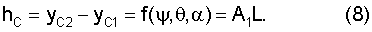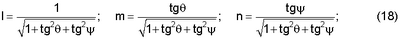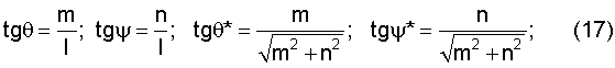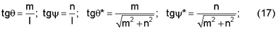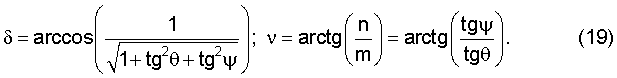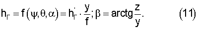 Для определения углов наклона метательного элемента решается система уравнений (10), (11) относительно , при измеренных длинах теней hг, hв, определенных знаках углов наклона и вычисленных по (13), (14) координатах пролета y, z. Затем вычисляются углы нутации и прецессии согласно фиг.2, из которой