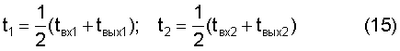 При полете метательный элемент последовательно пересекает световые экраны 41, 42, образованные линейными протяженными излучателями 21, 22 и оптически связанными с ними оптико-электронными преобразователями 31, 32, световые экраны 61, 62, образованные излучателями 23, 24 и оптически связанными с ними камерами с фотолинейками 51, 52, световые экраны 81, 82, образованные излучателями 23, 24 и оптически связанными с ними камерами с фотолинейками 71, 72. При пересечении первых световых экранов 21, 22 часть светового потока, падающего от излучателей на фотоприемники оптико-электронных преобразователей, затеняется и на выходах усилителей фототоков формируются электрические импульсы, передние фронты которых соответствуют моментам входа метательного элемента в световые экраны, а задние фронты – моментам выхода метательного элемента из световых экранов. Эти сигналы по коаксиальным линиям связи 9 поступают на входы усилителей-формирователей 111, 112 блока формирующих и пороговых устройств 10, а с выходов усилителей-формирователей 111, 112 – на входы пороговых устройств (компараторов) с прямыми входами 121, 122 и с инверсными входами 131, 132. Электрические сигналы с выходов компараторов объединяются по схеме ИЛИ 14 и с выхода поступают на вход прерывания ЭВМ 15. По сигналам прерывания фиксируются состояния таймера ЭВМ и коды времени, соответствующие моментам входа tвх1, tвх2 метательного элемента в световые экраны и моментам выхода tвых1, tвых2 из них, и записываются в память ЭВМ. После записи последнего кода вычисляются средние значения соответствующие прохождению через экраны середины метательного элемента, вычисляется скорость полета (S расстояние между световыми экранами 11, 12), вычисляется время подлета метательного элемента к световым экранам 61, 62, равное (S1 – расстояние между экраном 42 и совмещенными экранами 61, 62, L – длина метательного элемента), вычисляется время прохождения серединой метательного элемента совмещенных световых экранов 61, 62, вычисляется время (с гарантией) вылета метательного элемента из световых экранов 81, 82, равное где S2 – расстояние между экраном 42 и камерами 71, 72. В момент времени tn по сигналу управления с выхода ЭВМ 15, поступающему на вход схемы управления 20 мультиплексора 17, с управляющих выходов схемы 20 поступают серии сдвигающих импульсов на входы всех фотолинеек 5i и 7i. Число сдвигающих импульсов равно количеству ячеек фотолинеек. В результате информация с фотолинеек выталкивается без запоминания, ячейки таким образом обнуляются, и начинается процесс накопления информации. В момент времени tc аналогично по управляющему сигналу с выхода ЭВМ 15 от схемы управления 20 мультиплексора 17 серии сдвигающих импульсов поступают на входы фотолинеек 51, 53. Бинарные коды с выходов компараторов 181, 183 запоминаются в устройстве 191, 193. В момент времени tв аналогично по управляющему сигналу с выхода ЭВМ 15 в мультиплексоре 17 формируются серии сдвигающих импульсов, поступающих на входы фотолинеек 71, 72. Аналогичным образом в устройствах запоминания 192, 194 запоминаются бинарные коды состояния фотолинеек 71, 72. После запоминания коды всех устройств запоминания 19i с информационного выхода мультиплексора 17 поступают на информационный вход ЭВМ 15. В ЭВМ производится анализ кодов, и по переходам из 0 в 1 и наоборот из 1 в 0 определяются границы теней на фотолинейка