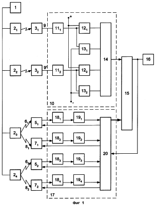 Приемник (оптико-электронный преобразователь) 3i (фиг.3) имеет прямоугольную щелевую диафрагму перед объективом (линзой) 21, в фокальной плоскости которой (на фокусном расстоянии или меньшем до 0,5 ‘) расположена чувствительная площадка фотоприемника (фотодиода) 22, выход которого соединен с входом усилителя фототока 23. Выходы усилителей фототока коаксиальными линиями связи 9 соединены с входами согласующих устройств 11.