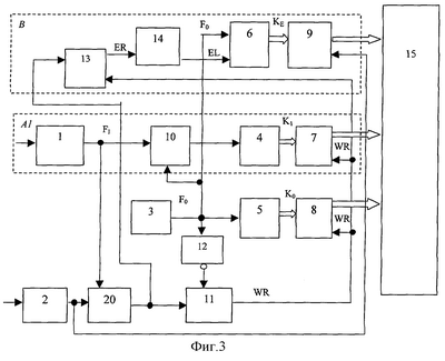 Предлагаемый цифровой частотомер изображен на фиг.3 и работает следующим образом. Устройство содержит порт приема входного сигнала 1, порт приема импульса измерительного периода 2, образцовый генератор 3, три счетчика (4, 5 и 6) с регистрами (7, 8 и 9) на выходе, две схемы синхронизации 10 и 11, инвертор 12, формирователь импульса ошибки 13, схему растяжки импульса 14 и средство обработки и индикации 15 и триггер 20. Для наглядности выделим канал счета импульсов А1, содержащий элементы 1, 10, 4 и 7 и канал уточнения задержки фронта В, образуемый элементами 13, 14, 6 и 9. Канал счета импульсов А1 осуществляет прием входного сигнала портом 1, синхронизацию сформированных импульсов F1 схемой синхронизации 10, их непрерывный подсчет счетчиком 4 и считывание показаний этого счетчика К1 в регистр 7 с приходом сигналов чтения WR. Одновременно счетчик 5 считает импульсы F0 образцового генератора 3, а его показание Ко переписывается в регистр 8 с приходом того же сигнала WR. Для формирования сигналов WR служит порт приема измерительного периода 2 и схема синхронизации 11, соединенная с выходом образцового генератора через инвертор 12. Высокая точность измерений обеспечивается каналом уточнения задержки фронта 18, позволяющим уточнить длительность импульса, поступающего на его вход. Для точного измерения этой длительности сформированный сигнал поступает на схему растяжки длительности 14, которая вырабатывает импульс EL, длительность которого увеличена в заданное число М раз, например М=100. Этот импульс поступает на управляющий вход счетчика 6, а на его счетный вход поступает сигнал образцовой частоты F0 с выхода образцового генератора 3. Результат KE счета счетчика 6 в течение существования импульса на его управляющем входе, пропорциональный этой длительности, считывается в регистр 9, и из него – в средство обработки и индикации (компьютер) 15, что дает возможность уточнить время поступления фронта измеряемого сигнала, от которого был сформирован импульс ошибки. Таким образом, канал счета импульсов осуществляет подсчет целого числа периодов измеряемой частоты, попадающих в измерительный интервал , задаваемый импульсами WR. Одновременный подсчет за эти интервалы импульсов с выхода образцового генератора 3 счетчиком 5 дает возможность вычисления временной шкалы, к которой привязываются результаты считывания показаний счетчика 4. Канал В позволяет уточнить интервал времени от момента формирования последнего фронта сигнала F1 в пределах измерительного периода до момента считывания кодов счетчиков 4, 5, 24 в регистры 8, 7 и 25 соответственно. Управление считыванием осуществляется сигналом WR, который синхронизован инвертированным импульсом опорной частоты. Считывание кода KE из счетчика 6 в регистр 9 осуществляется раньше, для чего служит импульс с выхода порта приема импульса измерительного периода 2. Соединение выхода элемента 2 с управляющим обнулением входом счетчика 6 может отсутствовать, так как счетчик 6 может обнуляться программно либо не обнуляться. Во втором случае результат счета в цикле измерения вычисляется как разность между полученным кодом и предыдущим, так же как это делается с результатами считывания кодов счетчиков 4, 5 и 24.