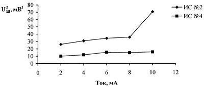 На 20 ИС типа К 137 ЛЕ 2 (схема эмиттерно-связанная логика) измерялось значение интенсивности шума по выводам “вход – общая точка”. Измерение интенсивности шума проводилось методом прямого измерения на частоте 1 кГц и значениях тока 2, 4, 6, 8, 10 мА. На графике зависимости от тока (чертеж) для наихудшей (схема №2) и наилучшей (схема №4) зависимостей видно, что при значениях тока до 8 мА зависимость от тока имеет вид прямой, а при значениях тока 10 мА у ряда схем значение резко возрастает, поэтому измерение проводилось при двух значениях тока: 6 мА и 10 мА. В таблице даны значения для 6 и 10 мА и величины относительного изменения: