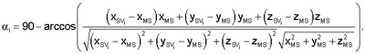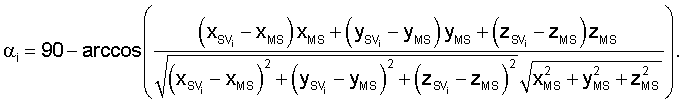 Каждая ячейка данной базы данных характеризуется диапазоном значений угла возвышения спутника и отношений сигнал – шум, т.е. в ячейку k заносится ошибка i-ого спутника, если угол возвышения спутника и отношение сигнал – шум для спутника попадают в диапазоны i [ k, k+1] и сn0i [сn0k, сn0k+1], которыми характеризуется данная ячейка. Таким образом, блок формирования базы данных 4 распределяет и запоминает поступающие значения разностных ошибок измерений псевдорасстояний по различным ячейкам в соответствии со значением сигнал – шум и углом возвышения спутника, для которого эти ошибки получены. Угол возвышения i-ого спутника рассчитывается следующим образом: