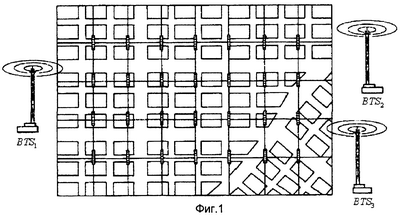 В этом способе предлагается установить в районе локации в известных точках множество излучателей, сформировав сеть из них, как показано на фиг.1 и фиг.2. Затем на базовых станциях сотовой сети (BTS1, BTS2, BTS3 и т.д.) измеряют ошибки от каждого излучателя (Tr1, Tr2, Tr3 и т.д.), связанные с непрямым распространением сигнала, и заносят их в базу данных. Таким образом, когда мобильная станция сделает запрос на определение местоположения, соседние базовые станции измерят задержки от мобильной станции и, используя заранее сформированную базу данных, скорректируют местоположение мобильной станции.