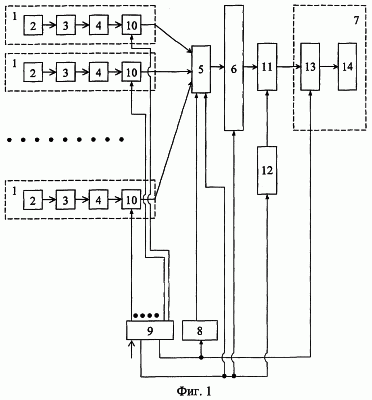 Блоки 10 (фиг.1) предварительной обработки и передачи данных могут быть выполнены различными способами. Например, в простейшем случае, каждый из блоков 10 может быть реализован следующим образом. Каждый из блоков 10 состоит из блока фильтров и блока формирования пакетов данных (на фиг.1 не показаны), соединенных последовательно. Вход блока фильтров подсоединен к выходу АЦП 4, а выход блока – формирования пакетов данных является выходом приемных каналов 1. К выходов запуска блока 9 управления – контроллера подсоединены к соответствующим К управляющим входам блоков формирования пакетов данных, которые являются управляющими входами блоков 10. Работает блок 10 предварительной обработки и передачи данных следующим образом. Данные с АЦП 4 передаются на блок фильтров, который преобразует высокочастотные данные в данные с требуемой для эксперимента частотой (например, 100 или 500 Гц). Затем сигналы с выхода блока фильтров поступают на вход блока формирования пакетов, который по сигналу с К-го выхода запуска блока 9 управления – контроллера формирует пакеты (блоки определенного размера и структуры) из потоков данных для передачи по каналам связи.