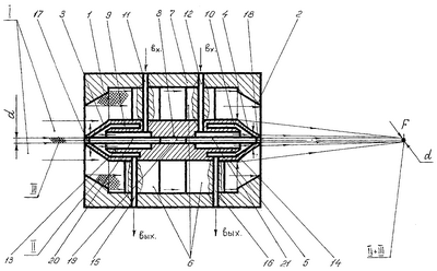Вырезанную из пучка I часть III излучения пропускают через отверстие трубки 20, канал 19, отверстие трубки 21 и подают в точку F сведения пучка II для суммирования с последним.