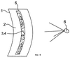 На фиг.4 изображен дополнительный вариант осуществления изобретения, где ламинарный транспортирующий поток 2 располагается путем подходящего конструирования структур устройства 1 для формирования потока и средства 5 подачи криволинейных по форме для того, чтобы сформировать изогнутый проекционный экран 3. Очевидно, что при конструировании структур устройства 1 для формирования потока и/или средства 5 подачи, можно легко выполнить и другие формы непланарных потоков. Планарный транспортирующий поток 2, при необходимости, можно выполнить с использованием средства 5 подачи, которое изогнуто по диагонали относительно направления потока, с изогнутым проекционным экраном 3 (на фиг.4 поперечное сечение устройства 1 для формирования потока является вытянутым, а средство подачи изогнутым), и, кроме того, можно также выполнить изогнутый транспортирующий поток 2 с использованием подходящего средства 5 подачи с плоским проекционным экраном 3.