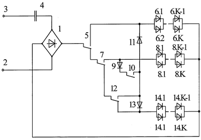 Выходы светодиодных цепей 6.1…6.К, 8.1…8.K, 14.1…14.K подключены к другому выходу диодного моста 1.