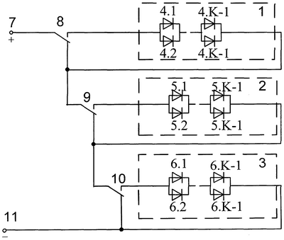 При замыкании общего и фронтового контактов третьего сигнального реле 10 при выключенном состоянии первого 8 и второго 9 сигнальных реле к третьей светодиодной цепи 3 подключаются полюса 7 и 11 источника электропитания. Через светодиоды 6.1,…6. К начинает протекать ток, вызывающий их свечение, то есть при подаче напряжения на третью светодиодную цепь 3 предлагаемое устройство имеет красное показание.