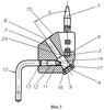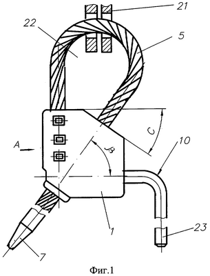 Гладкое отверстие 2, в котором жестко посредством обжатия корпуса в нескольких местах закреплен пассивный конец 6 троса 5, выполнено глухим. При этом другое гладкое отверстие 3, которое выполнено сквозным, расположено под острым углом к глухому, а резьбовое отверстие 4 расположено под острым углом к сквозному отверстию 3, измеренным в направлении прилагаемого усилия при попытке несанкционированного вскрытия устройства. Причем оси гладких отверстий – глухого 2 и сквозного 3 и резьбового отверстия 4 расположены в одной плоскости. Угол выбран в пределах 35-45°, а угол выбран в пределах 55-45°. Корпус устройства выполнен по форме в виде плоского многогранника, при этом входной участок 8 сквозного отверстия 3 расположен на грани 15, которая перпендикулярна оси сквозного отверстия 3. Но, как видно, грань 15 расположена наклонно по отношению к горизонтали или, что то же самое, под углом к оси глухого отверстия 2. Это создает хороший обзор при заправке свободного конца троса, а следовательно, и удобной его заправке. Угол наклона с указанной грани 15 к горизонтали зависит от угла , под которым расположено сквозное отверстие 3 по отношению к глухому отверстию 2.
