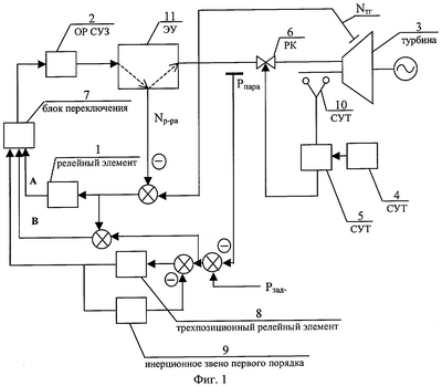 Управление турбиной 3 осуществляют системой управления турбиной (СУТ) 4, 5, 10, функционирующей в режиме поддержания мощности турбины и воздействующей на регулирующие клапаны (РК) 6.