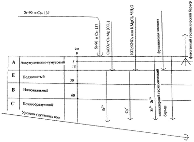 Инфильтрация молекулярных растворов (см. чертеж), содержащих Sr2+ и Cs+, продолжается до горизонта В и почвообразующего субстрата (горизонт С) Здесь молекулярные растворы расходуют часть воды на смачивание гидрофильных стенок капиллярных полостей (Шур А.С. Роль капиллярных явлений в процессах минерало- и рудообразования. М.: АН СССР, 1964, с.13-22). Как следствие при потере воды происходит коагуляция молекулярных растворов и образование слабоподвижных гидрозолей. Свободные ионы Sr2+ и Cs+ сорбируются глинистыми минералами, гидроокислами железа и алюминия (сорбционный геохимический барьер).