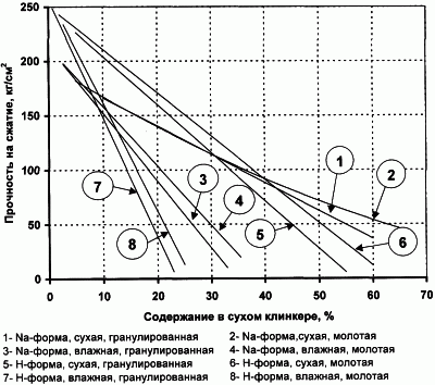 На чертеже показаны зависимости прочности компаунда от содержания смолы в исходном клинкере для различных вариантов локализации ионообменных смол.