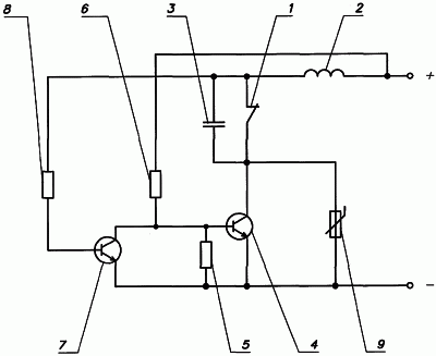 Для запирания управляемого электронного ключа 4 при появлении напряжения на размыкающем контакте служит транзистор 7, первый выходной вывод которого соединен с входным выводом управляемого электронного ключа 4, а второй выходной вывод соединен с минусом (-) источника питания. Входной вывод транзистора 7 через резистор 8 соединен с первыми выводами размыкающего контакта и конденсатора. Для ограничения перенапряжений на управляемом электронном ключе 4 между его выходными выводами подключен варистор 9.