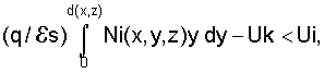 где Ui – напряжение пробоя полупроводникового слоя 1, у – координата, отсчитываемая от металлургической границы р-n-перехода или барьера Шоттки в направлении вдоль толщины слоя 1, q -элементарный заряд, Ni(x,y,z) – профиль распределения примеси в слое 1, d(x,z) – толщина слоя 1; z, х – координаты на поверхности слоя 1; s – диэлектрическая проницаемость слоя 1, Uk – встроенный потенциал.