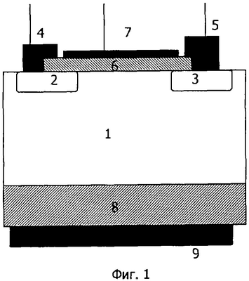В описанных примерах никак не был задействован омический контакт 5 к сильнолегированной области 3. Это означает, что сильнолегированные области 2 и 3 могут быть омически соединены друг с другом (то есть выполнены в виде одной области либо иметь общий омический контакт). Либо область 3 и омический контакт к ней могут иметь бесконечно малые размеры, то есть отсутствовать. Однако наличие области 3 и омического контакта к ней 5 имеет свои плюсы. Поскольку при подаче постоянного напряжения между контактами 4 и 5 более эффективно идет рассасывание подвижных носителей заряда (они переходят под воздействием электрического поля от истока к стоку или от стока к истоку (в зависимости от направления поля). То есть в этом случае укорачивается время переходных процессов, что важно при работе прибора на больших частотах.