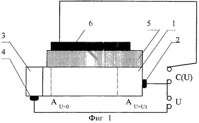 На n-типа подложке 1 с концентрацией примесей 1016 см-3 был сформирован полупроводниковый р-типа слой 3 с концентрацией примесей 5·1019 см-3, толщиной 0,2 мкм. Были выполнены омические контакты к р- и n-областям. На поверхности слоя 3 был посредством термического окисления сформирован слой 5 из двуокиси кремния толщиной 0,1 мкм. На поверхности двуокиси кремния на площади 0,1 см2 был сформирован из алюминия проводящий участок 6. Схематическое изображение полученного устройства приведено на фиг.5, на которой 1 – n-типа слой, 3 – слой р-типа, 6 – проводящий участок, изолирующий слой из двуокиси кремния – 5, 4 – омический контакт к слою 3, 2 – омический контакт к слою 1. Было произведено измерение величины управляемой емкости между контактом 2 и проводящим участком 6. При изменении запирающего напряжения между контактами 2 и 4 от 0 до 10 В величина управляемой емкости изменялась от 950 до 300 Ф.