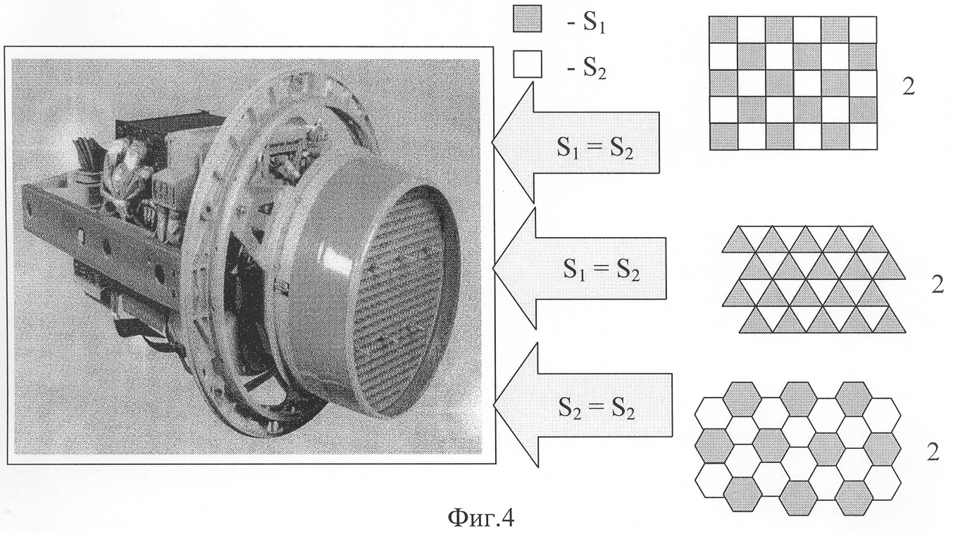 независимо от формы и способа их размещения, где S1 и S2 суммарная площадь поверхности соответственно первой и второй половины общего числа излучателей (фиг.4). Пространственное смещение их друг относительно друга на нечетное число четвертей длины волны обеспечивает противофазность волн, отраженных от поверхностей одинаковых по площади излучателей. При данном расстоянии между поверхностями излучателей происходит сложение отраженных волн в противофазе. Иначе говоря, гашение падающей волны происходит при сдвиге ее фазы на ,