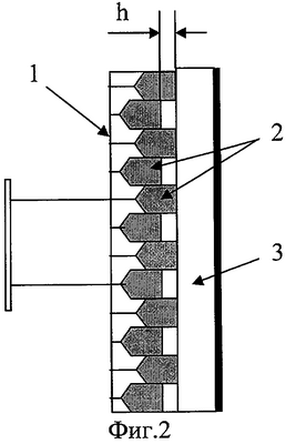 Данная цель достигается тем, что в известном устройстве антенны с уменьшенной поверхностью обратного рассеивания 1 (фиг.2), содержащей минимум два излучателя 2, работающих в заданной полосе рабочих частот, размещенных перед излучателями в одной плоскости устройств частотной селекции 3 с полосовыми характеристиками, позволяющими пропускать электромагнитное излучение в полосе рабочих частот, а за пределами этой полосы отражать излучение, первую половину всех излучателей пространственно разносят относительно второй половины излучателей вдоль направления излучения на одинаковое расстояние h, равное нечетному числу четверти средней рабочей длины волны , при этом поперечные размеры излучателей соизмеримы со средней рабочей длиной волны.