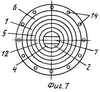 Вариант свечи по фиг.6, 7 содержит пример реализации с фаской под углом 45° на торце корпуса 1 свечи и боковой поверхности корпуса, в середине которой расположены восемь сквозных отверстий, соединяющихся с кольцевой проточкой на изоляторе 3, прилегающей к боковому электроду-корпусу 1.