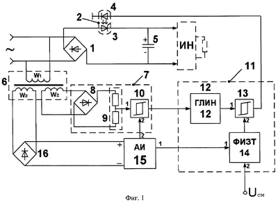 Минусовой вывод сетевого выпрямителя 1 соединен с минусовой обкладкой низкочастотного конденсатора 5, плюсовой вывод через тиристор 3 подключен к плюсовой обкладке конденсатора 5, выводы которого параллельно подключены к нагрузке – инвертору напряжения (ИН). В блоке сетевой синхронизации 7 выводы выпрямителя 8 через резистивный делитель напряжения 9 подключены к первому входу первого компаратора 10, выход которого подключен к входу ГЛИН 12, выход которого соединен с первым входом второго компаратора 13, выход которого соединен с анодом светодиода 4 тиристорной оптопары 2.