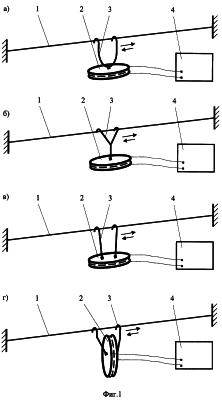 На фиг.1 изображен пьезоэлектрический двигатель, где 1 – статор, выполненный в виде горизонтально натянутой металлической струны, 2 – пьезоэлемент и 3 – подвеска, составляющие якорь, 4 – генератор переменного напряжения. Варианты двигателя а)-г) отличаются исполнением подвески.