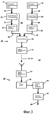 На фиг. 3 изображен первый предпочтительный вариант осуществления системы 30 цифровой широковещательной передачи с квантованием времени, включающей в себя систему 20 передатчика и подвижный терминал 40. Первый сигнал 25 данных, формируемый у первого поставщика 17 информационных услуг в системе передатчика, делают доступным через сетевую линию связи (не изображена) для передачи по направлению основного трафика клиенту с использованием приемника 41 цифровой широковещательной передачи в подвижном терминале 40. Заранее определенный интервал поточной информации в сигнале 25 данных сначала буферизируют в первом входном буфере 35 обслуживания в виде буферизированных данных 27. Первый входной буфер 35 обслуживания может быть, например, буфером типа “первым пришел, первым вышел” (FIFO, ПППВ), гибким буфером, кольцевым буфером или двойным буфером, имеющим отдельные входную и выходную секции.