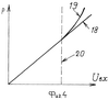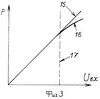 На фиг.3 показан график зависимости звукового давления (р), развиваемого громкоговорителем, от входного напряжения усилителя (Uвх) при питании громкоговорителя от обычного усилителя, т.е. усилителя напряжения. Вертикальная ось – ось звукового давления р, а горизонтальная ось – ось входного напряжения Uвх. График 15 показывает звуковое давление, которое развивалось бы громкоговорителем, если бы не было нагрева катушек, а график 16 – звуковое давление, развиваемое реальным громкоговорителем. Область правее напряжения 17 является областью термокомпрессии для реального громкоговорителя.