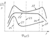 На фиг.5. показан график зависимости модуля импеданса 21 динамической головки или однополосного громкоговорителя от частоты и его амплитудно-частотная характеристика по звуковому давлению при работе от обычного усилителя напряжения 22 и при работе от усилителя с большим выходным сопротивлением 23. График импеданса имеет максимум на частоте резонанса головки 24 и подъем после частоты 25, вызванный индуктивностью звуковой катушки. АЧХ громкоговорителя линейна между верхней 24 и нижней 26 частотами среза. Если громкоговоритель питать от источника тока, то АЧХ имеет максимум на резонансной частоте 24 и подъем от частоты 25 до максимальной частоты 27. Таким образом, график АЧХ 23 имеет сходный вид с графиком импеданса 21. Вертикальная ось – ось модуля импеданса |Z| звукового давления р, а горизонтальная ось – ось входного напряжения Uвх.