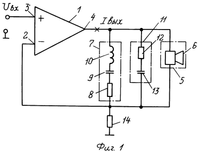 Входное напряжение Uвх подается на неинвертирующий вход 3 усилителя 1. Головка 6 громкоговорителя 5 и резистор 14 образуют для усилителя 1 цепь отрицательной обратной связи, а усилитель в таком включении является для головки 6 источником тока, т.е. имеет выходное сопротивление, значительно большее максимума модуля импеданса головки 6.