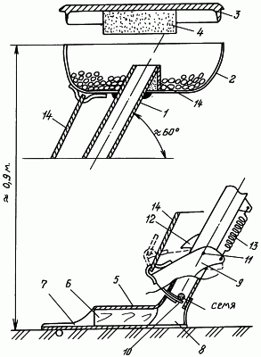 Нижний конец семяпровода 1 заканчивается пяткой 5, которая представляет собой отрезок трубки такого же диаметра, как и трубка (семяпровод) 1. Пятка 5 прикреплена к семяпроводу 1 под углом порядка 120°. Внутренняя полость пятки 5 заглушена пробкой 6. Заканчивается пятка 5 небольшой лопаткой 7, а ее передняя часть имеет фартучную камеру 8. В нижней части семяпровода 1 монтируется также шибер 9 с заслонкой 10. Шибер 9 закреплен на семяпроводе 1 шарнирно и может ограниченно поворачиваться вокруг цапфы 11. Шибер 9 имеет две щеки, обегающие семяпровод 1 и две цапфы. Поворот шибера 9 ограничивается упором 12 и прилеганием заслонки 10 к внутренней стенке семяпровода 1 под действием пружины 13. Поворот шибера 9 до упора 12 осуществляется тягой 14.