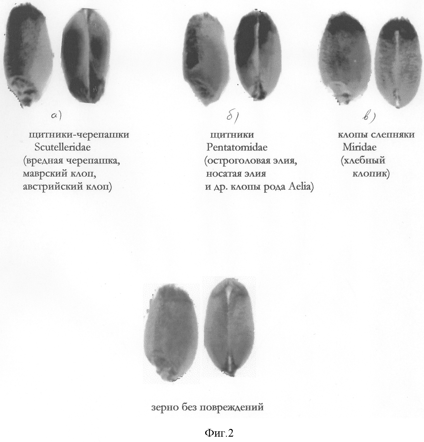 Пример 2. Диагностическая шкала повреждений зерна пшеницы вредной черепашкой и другими видами хлебных клонов представлены на фиг.2, 2а, 2б, 2в.