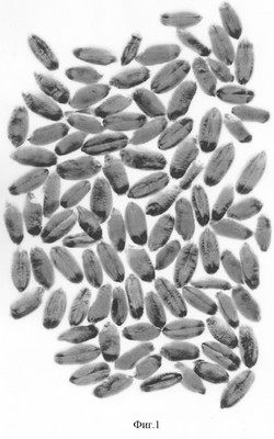 Пример 1. Для анализа образца отбирают 500 зерен (5 проб по 100 зерен), далее пробы зерна помещают на прозрачное неподвижное стекло сканера, вдоль которого передвигается сканирующая каретка с источником света. Приемный элемент преобразует уровень освещенности отраженного светового потока. Аналоговый сигнал поступает на аналого-цифровой преобразователь цвета и информация об анализируемом объекте в «знакомом» компьютеру виде переводится на файл с объемным изображением пробы зерна. Сканирующий эффект и цветовая трансформация делают отчетливо видимыми локализацию и глубину повреждения зерновок вредителями (фиг.1).