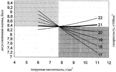 Из приведенной номограммы видно, что при всем возможном разнообразии титруемых кислот для сорта Виорика границей содержания сахара для получения качественного сухого вина является сахаристость винограда 21%. Варьирование кислот от 6 до 11 г/дм3 при этой сахаристости не меняет дегустационную оценку 8,4 балла.