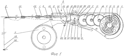 Пуск и остановку работы механизмов удочки производят посредством нажатия рычага 7 с зубьями, которые могут входить в зацепление с ведомым зубчатым колесом 5, и установленного на оси 32. Рычаг 7 снабжен пружиной 33, соединенной с корпусом 3, и имеет фиксатор 34, закрепляющий его положение соответственно при пуске работы механического привода для работы в автономном режиме.