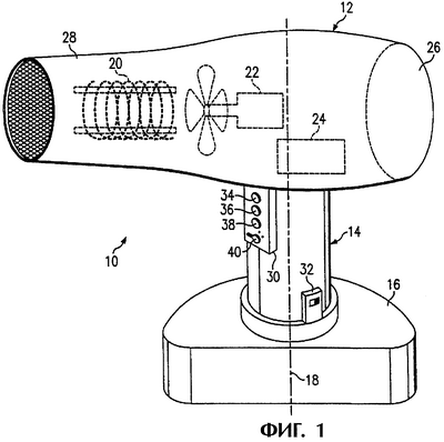 Как показано на фиг.1, та часть 14 корпуса, которая служит ручкой, имеет продольную осевую линию, которая проходит, по существу, в поперечном направлении относительно части 12 корпуса, имеющей удлиненную форму, и вдоль осевой линии массы 18 этой части. С другой стороны, узел подставки 16, показанный на фиг.1, также имеет свою линию массы, которая при присоединении этого узла к той части корпуса, которая служит ручкой, лежит, по существу, на продольной осевой линии, совпадающей с осевой линией массы 18, благодаря чему: /1/ обеспечивается подача электроэнергии к устройствам ручного управления 30, и /2/ плоская подставка 16 может представлять собой конструкцию, обеспечивающую для вентилятора, предназначенного для сушки волос, возможность находиться в обособленном положении.