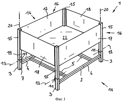 В этом примере ножки 3 и продольные 4 и поперечные 5 перекладины образованы квадратной трубой. То же относится к четырем стойкам 15, которые направлены от ножек 3 вверх. Каждая стойка 15 с помощью шарнира 11, расположенного соответственно на внутренней стенке 19 стоек 15 и на внутренней стенке 7 ножек 3, установлена с возможностью поворота вокруг горизонтальной оси 13. Каждые две находящиеся на продольной стороне 14 стола 1 стойки 15 несут первую стенку 17, за счет чего образуются две боковые рамы 16. На каждой боковой раме 16 с расположенной напротив по диагонали стойкой 15 вторая стенка 18 сочленена с возможностью ее поворота вокруг вертикальной оси 20. Вторые стенки 18 разъемно фиксированы соответственно на противоположно свободной стойке 15. Внутри стенок 17, 18 и над базовой рамой 2 находится дно 22, которое может быть уложено сверху между стенками 17, 18 и опирается внизу, по меньшей мере, на две стенки 17 и/или 18.