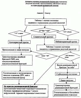 Способ оказания медицинской помощи больным с острым пероральным отравлением уксусной кислотой на догоспитальном этапе, характеризующийся тем, что при обращении пациента за медицинской помощью определяют “дозу-экспозицию”, возраст, почасовой диурез, наличие гемолиза, экзотоксического шока, отека гортани, гемоглобинурии, измеряют температуру тела, каждый признак оценивают в баллах, а именно: наличие гемолиза оценивают как “+3” балла, его отсутствие как “-9” баллов; почасовой диурез менее 30 мл/ч оценивают как “+6” баллов, более 30 мл/ч как “-5” баллов; развитие экзотоксического шока оценивают как “+10” баллов, его отсутствие как “-2” балла; “доза-экспозиция” менее 3 ч, а объем до 50 мл оценивают как “-4” балла, “доза-экспозиция” менее 3 ч, а объем от 50 до 100 мл как “+2” балла “доза-экспозиция” менее 3 ч, а объем >100 мл как “+6” баллов, “доза-экспозиция” более 3 ч, а объем до 50 мл как “-8” баллов, “доза-экспозиция” более 3 ч, а объем от 50 до 100 мл как “-2” балла, “доза-экспозиция” более 3 ч, а объем >100 мл как “+9” баллов; возраст (лет) до 40 оценивают как “-9” баллов, от 40 до 70 как “+2” балла, >70 лет как “+5” балла; температура тела нормальная оценивают как “+3” балла, 37°C как “+3” балла, >37°C как “-6” баллов; наличие гемоглобинурии оценивают как “+4” балла, ее отсутствие как “-4” балла; наличие отека гортани оценивают как “+4” балла, его отсутствие как “-2” балла, полученные данные суммируют и при сумме баллов менее “-17” прогноз благоприятный, линейной бригадой проводят лаваж желудка, обезболивание, введение спазмолитиков и кортикостероидов, осуществляют транспортировку больного в стационар, при сумме баллов от “-17” до “+23” прогноз исхода остается сомнительным с возможностью летального исхода, при сумме баллов более “+23” прогноз неблагоприятный, в последних двух случаях дополнительно определяют дозу яда независимо от экспозиции, рвоту и ее характер, наличие пищеводно-желудочного кровотечения, гемолиза, олигурии: отека гортани, экзотоксического шока, гемоглобинурии, измеряют температуру тела, каждый признак оценивают в баллах, а именно: пищеводно-желудочное кровотечение оценивают как “+13” баллов, отсутствие как “-2” балла; отсутствие рвоты оценивают как “-3” балла, однократная рвота как “-3” балла; многократная рвота как “+8” баллов, однократная с кровью как “+5” баллов; многократная с кровью как “+12”; отсутствие гемолиза оценивают как “-7” присутствие как “+4” балла; доза яда до 30 мл оценивают как “-6” баллов, от 3 до 50 мл как “0” баллов, от 50 до 100 мл как “+5” баллов, >100 мл как “+10” баллов; наличие гемоглобинурии оценивают как “+7” баллов, отсутствие как “-2” балла; наличие экзотоксического шока оценивают как “+12” баллов, отсутствие экзотоксического шока как “-1” балл; температуру тела пациента до 37°C оценивают как “+2” балла, температуру 37°C как “-4” балла, температуру тела пациента больше 37,0°C как “-6” баллов; наличие олигурии оценивают как “+6” баллов, отсутствие как “-2” балла; наличие отека гортани оценивают как “+4” балла, отсутствие как “-2” балла, полученные данные суммируют, при сумме баллов менее “-20” линейной бригадой СМП проводят премедикацию и лаваж желудка, после чего осуществляют госпитализацию больного, при сумме баллов более “+20” линейной бригадой осуществляют вызов специализированной реанимационной бригады СМП 