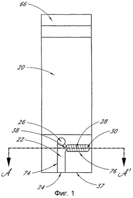 Затем второй тонкий слой 54 электрода прикрепляется к противоположной стороне 72 слоя 36 материала с большим электрическим сопротивлением, также простираясь поверх отверстия, формирующего камеру 28 обнаружения, таким образом, чтобы сформировать вторую торцевую стенку 62. В предпочтительном варианте воплощения слои 52 и 54 электродов прикрепляются друг напротив друга на расстоянии менее примерно 500 микрон, более предпочтительно – менее 150 микрон, а наиболее предпочтительно – в пределах между 50 и 150 микронами. Если вход 24 для пробы еще не был сформирован, он создается, например, путем формирования выреза в краю 37 устройства 20, который пересекает ближний край 24 реакционной камеры 22.