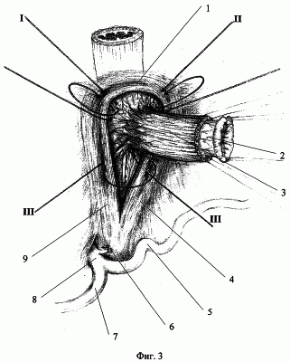 Выполняют гастрэктомию, при необходимости с резекцией части абдоминального отдела пищевода. Пищеводное отверстие диафрагмы сужают до диаметра пищевода за счет наложения тре 8-образных вшивных швов-связок, на ножки диафрагмы фиксируют стенки пищевода за остатки пищеводно-диафрагмальной мембраны, параэзофагеальную клетчатку и сосудисто-нервные пучки, входящие в стенку пищевода (Фиг.3).